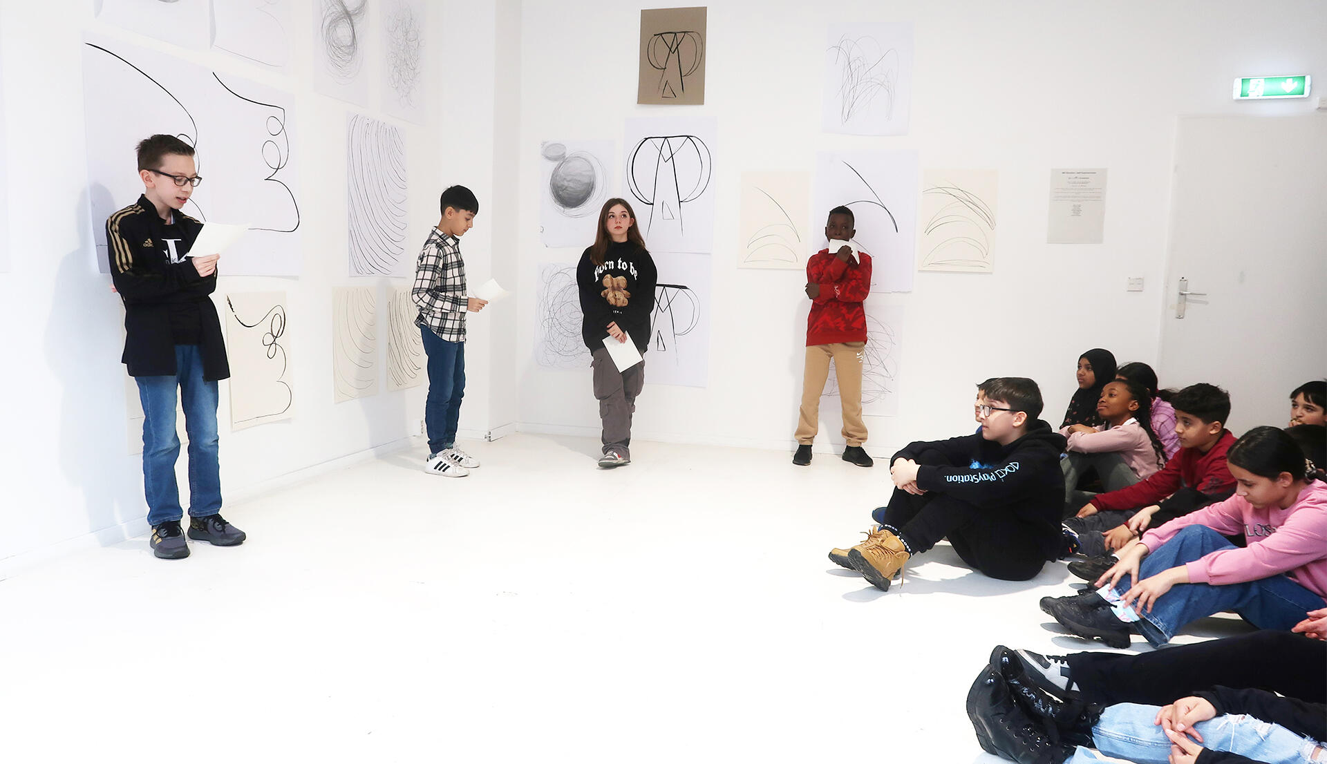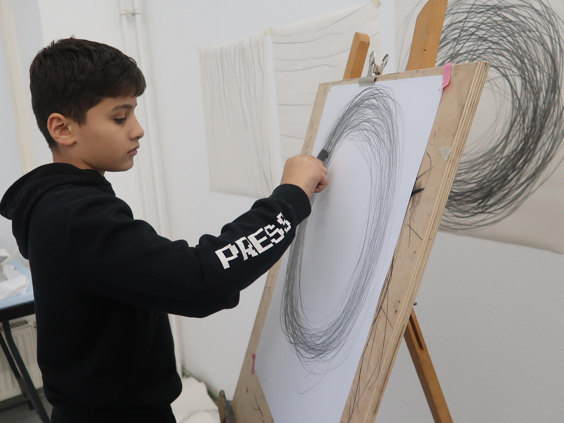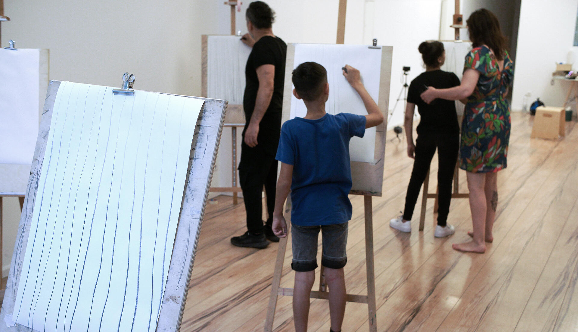 Using simple strokes — straight, curved, vertical, horizontal — participants explore an “alphabet of drawing.”Lines evolve into gestures, gestures into compositions.Working with charcoal and graphite on large paper, the body and mind engage fully in the creative process.Each line becomes a personal expression.